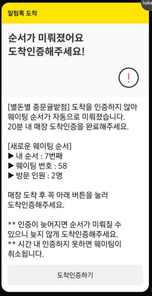20분내에 도착인증 버튼을 못누를 정도로 멀다면 자동으로 순서가 미뤄져여 ㅎㅎ
