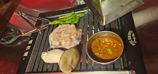그래서 672숙성 흑돼지 2인이랑 항정살(추가), 솥밥, 김치찌개, 냉면 시켰어요.