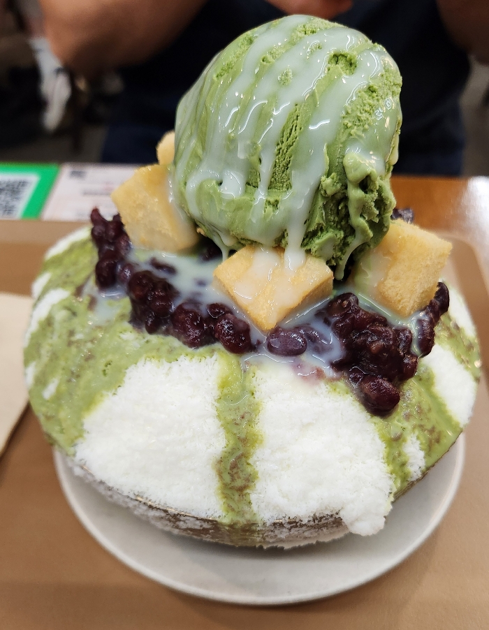 녹차아이스크림과 팥, 인절미가 올라간 빙수에요ㅎㅎ