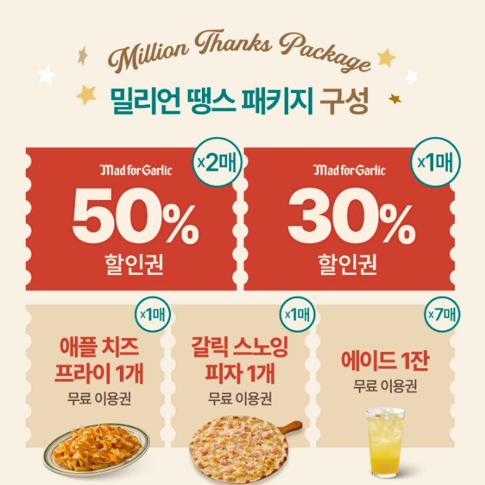 예시처럼 할인권끼리 같이 사용은 불가능하고 무료이용권 중 갈릭스노잉피자 + 애플치즈프라이무료이용권 사용도 불가능이에요